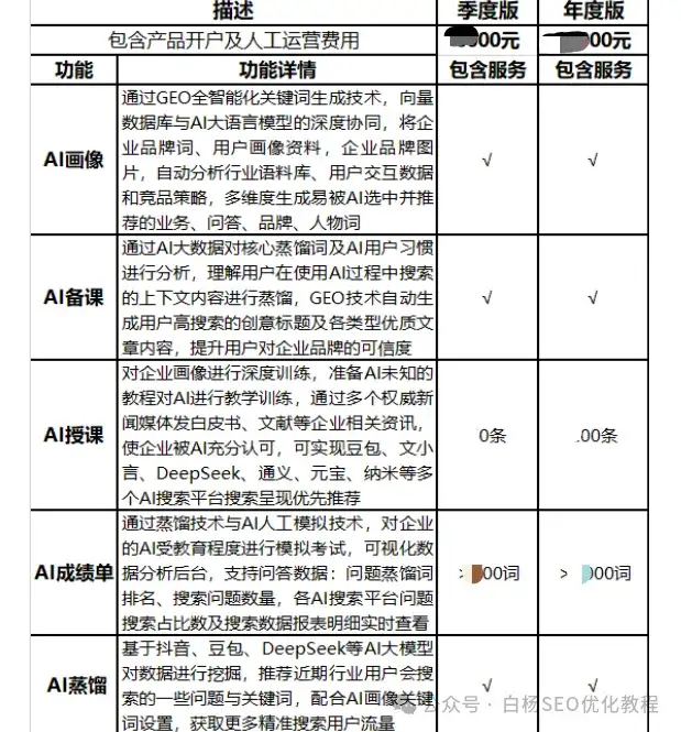 当下搞互联网流量最火的莫过于GEO了,也就是AI搜索优化,各种代理,各种代做报价都来了,我也在付费群同步了一个别人给我的报价图,哈哈。