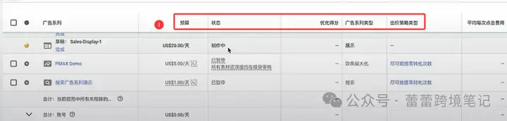 1.广告属性:预算、状态、优化得分、广告系列类型、出价策略类型、
