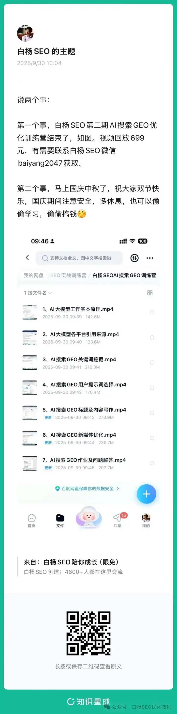 另:9月白杨SEOAI搜索优化GEO实战训练营第二期结束了,回放课程目前如下图。有需要联系白杨SEO购买,699,同时赠送299每年的全网流量交流群免费进。