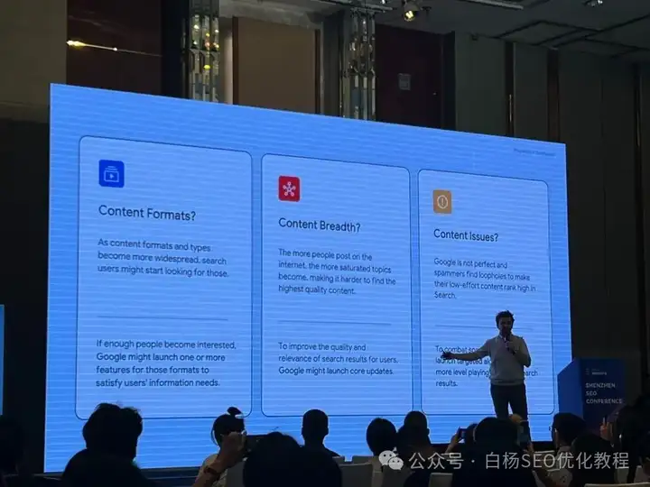 白杨SEO里有粉丝参加了上次深圳SEO大会吗?有的话可以留个言。这次大会,除了张亚楠讲到这些,比如像我们SEO前辈ZAC据说也有来,不知道分享的是什么主题?