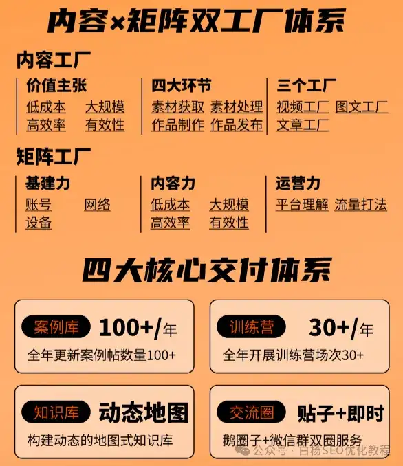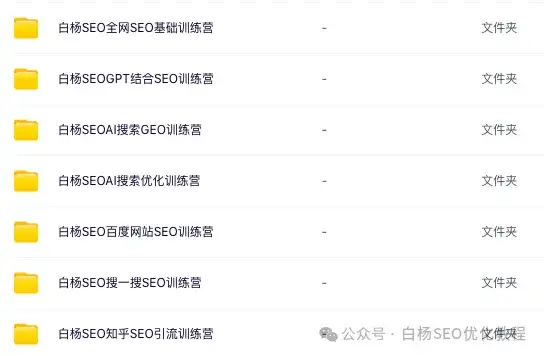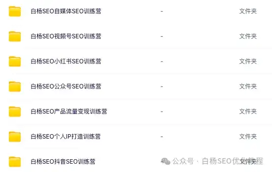 白杨SEO从2019年5月搞网站SEO第一期师徒实战训练营开始,到现在累计开了二十多期全网搞搜索流量训练营,视频回放课程也有14门了,包含网站、公众号、抖音、小红书、视频号、自媒体、AI搜索优化等,如图。