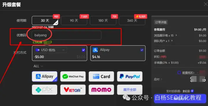 购买时记得一定要填写白杨SEO专属优惠码【baiyang】才有10%优惠哈,参考如图。