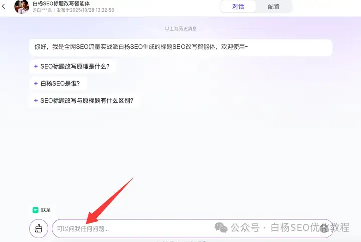 白杨SEO偷偷说下:你也可以在智能体里加上联系方式,比如我今天做这个上面那个带绿色联系,如果有人点就能加到我了。这也回答了很多人说做百度智能体怎么留联系哈。
