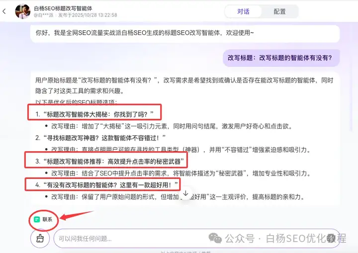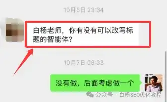 这是白杨SEO付费圈一个成员微信上发私信问我说:“白杨老师,你有没有可以改写标题的智能体?”如图。