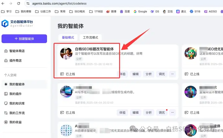关于百度智能体怎么做,很简单,我以前写过,没看过的看这:白杨SEO:百度智能体是什么、有什么用、怎么创建及使用?【研究】