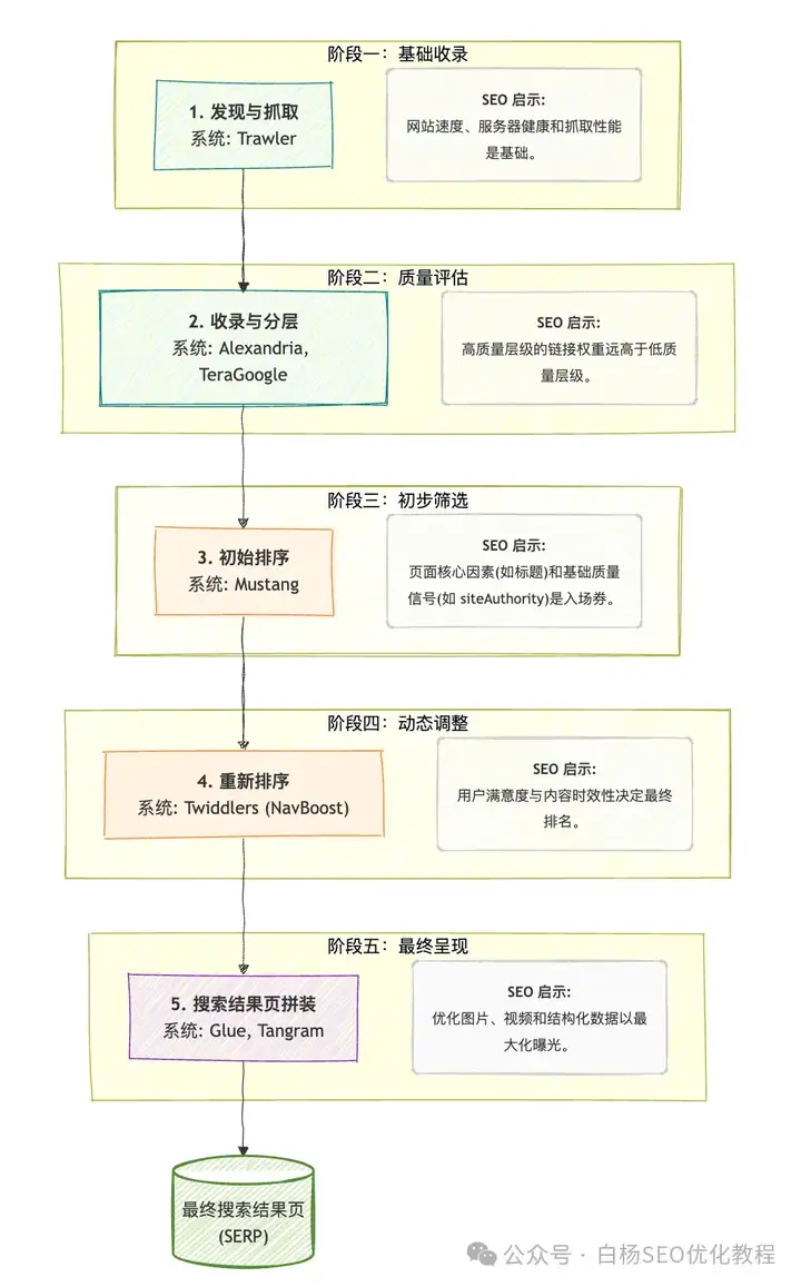 这个多阶段架构说明,Google 排序过程远比简单的指标计算要复杂得多。