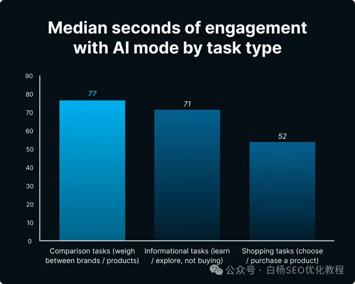 有 75% 的访问中,用户都是沉浸在 AI 模式的界面浏览,停留时间一般在 50~70 多秒,而 AI 概览的时间会少一半。从数据来看,AI 模式更像是一种独立的搜索体验,AI 概览像是传统搜索的一部分。