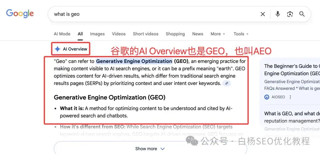 相关看:GEO、AIO、AISEO、AI搜索引擎优化与SEO有什么区别?为什么白杨SEO要去观察、研究和实战一些新的做流量方法?【必看】
