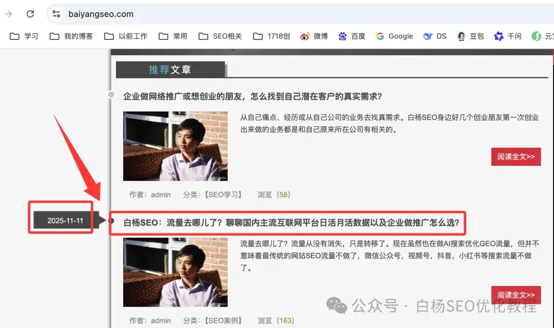 拿白杨SEO来说,我为什么周更原创公众号文章?为什么要同步到白杨SEO博客上,其实也是这个目的,哈哈哈。