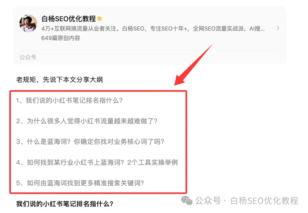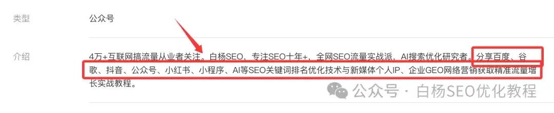 拿白杨SEO自己举例,这个以前只是网站SEO公众号,现在新媒体SEO,甚至AI搜索优化GEO等都有在写了是不是?如图我的公众号介绍。