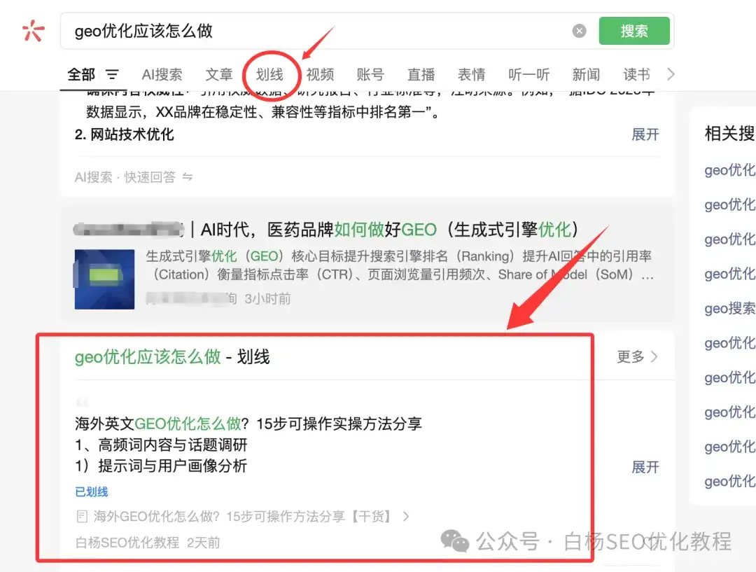 展示样式如上图,我也做了个测试,你们也可以在微信搜一搜搜下这个关键词【geo优化应该怎么做】看有没有白杨SEO这个公众号内容。