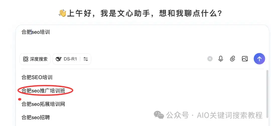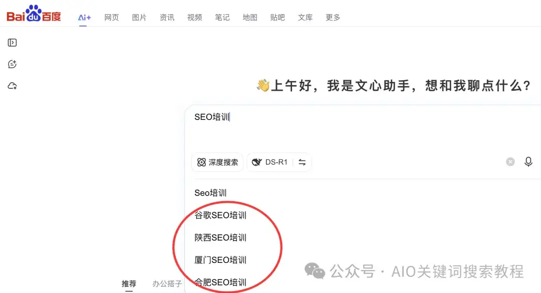 第三步,我们可以用百度AI自带的下拉去找到用户在AI下的提示词,我们还是以SEO培训举例,如图。