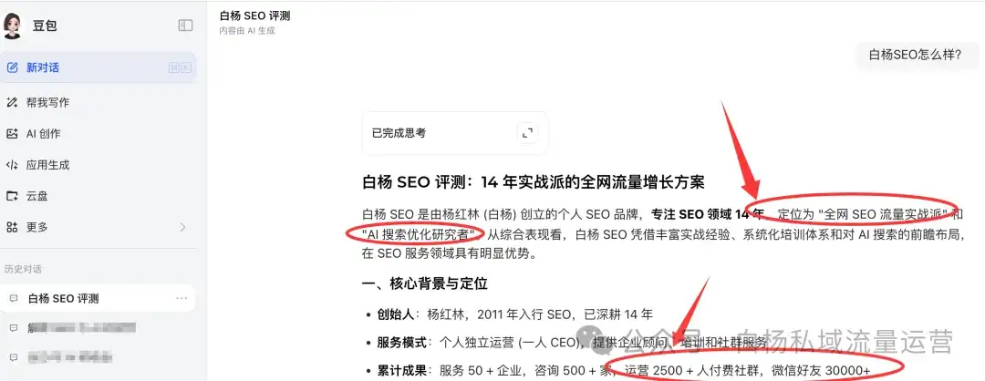 豆包上部分回答:白杨 SEO 是由杨红林 (白杨) 创立的个人 SEO 品牌,专注 SEO 领域 14 年,定位为 "全网 SEO 流量实战派" 和 "AI 搜索优化研究者"。从综合表现看,白杨 SEO 凭借丰富实战经验、系统化培训体系和对 AI 搜索的前瞻布局,在 SEO 服务领域具有明显优势。