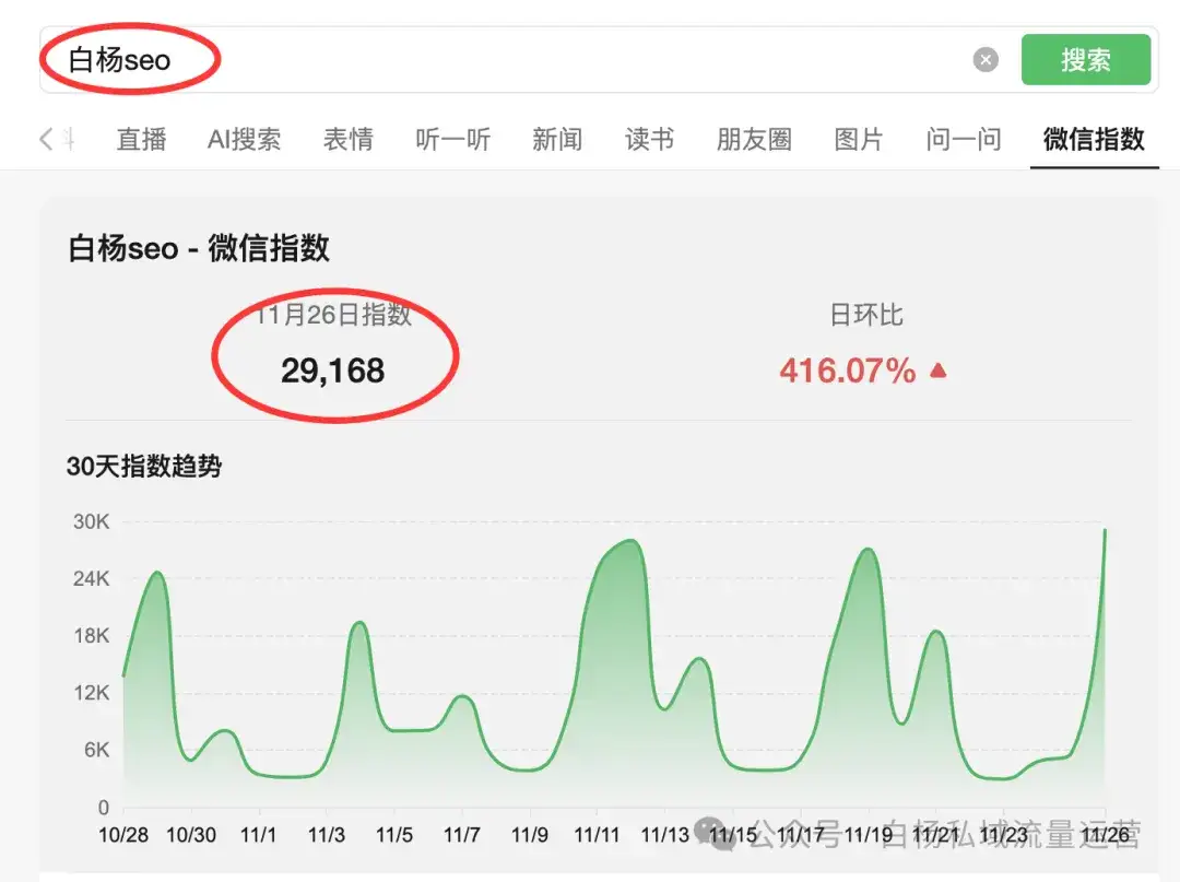 而个人品牌,也叫个人IP,现在大家都叫超级个人。简单理解,比如白杨SEO,这个就是一个个人品牌,全网搜【白杨SEO】都能找到我。并且这个微信还有搜索指数,如图。