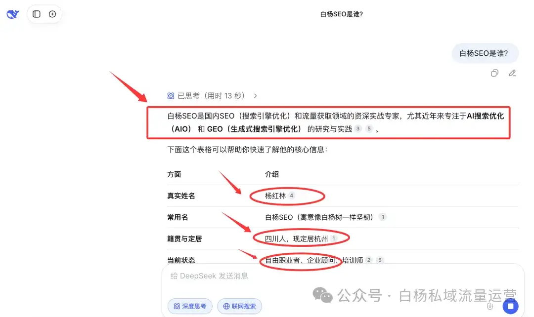 deepseek上关于白杨SEO是谁,部分回答:白杨SEO是国内SEO(搜索引擎优化)和流量获取领域的资深实战专家,尤其近年来专注于AI搜索优化(AIO) 和 GEO(生成式搜索引擎优化) 的研究与实践。