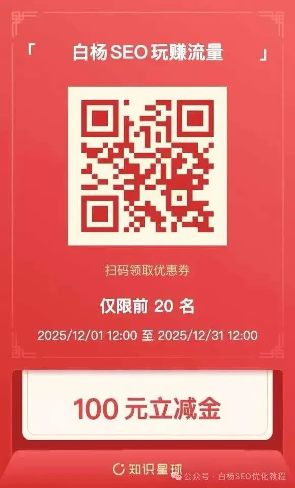忘了,要加白杨SEO星球的话,12月有个限时活动,即有20张100优惠券,原价299星球优惠后只要199,感兴趣扫,先到先得,错过无。