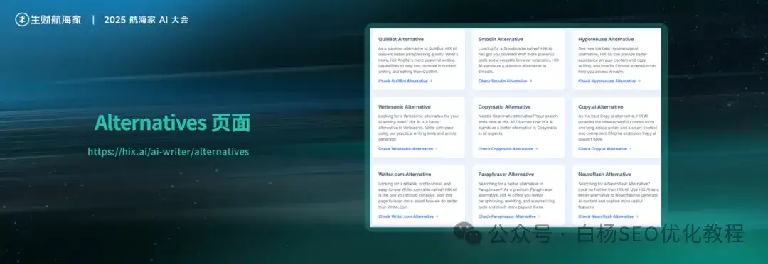 ③竞品对比页面(Alternative Pages):例如,以“AI视频生成”为例,可以创建“Midjourney的替代品”、“Runway的替代品”等页面。