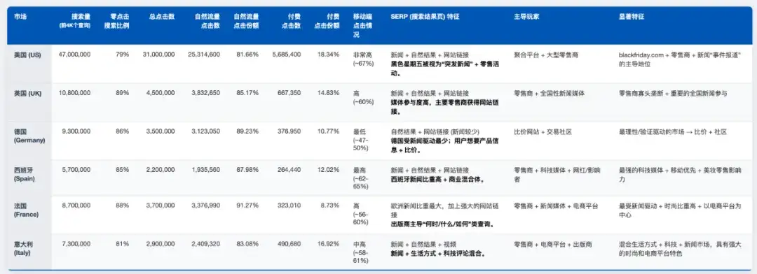 Aleyda Solis 基于 Similarweb 数据,对过去 28 天内美国、英国、德国、西班牙、法国和意大利的 4000 个最热门的“黑色星期五”搜索词进行了自然搜索流量和排名分析,得到了以下重要结论: