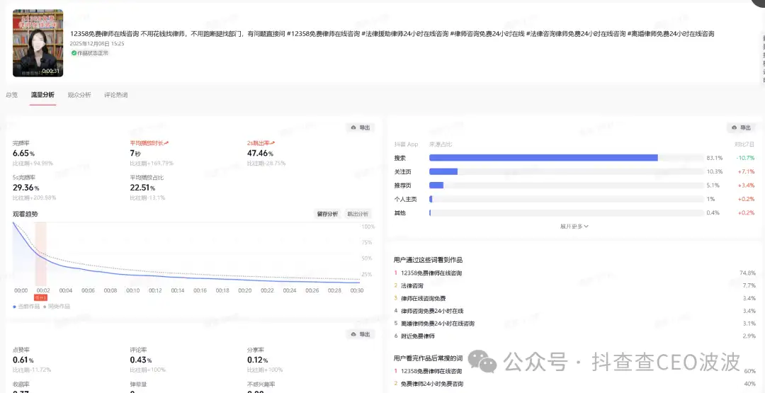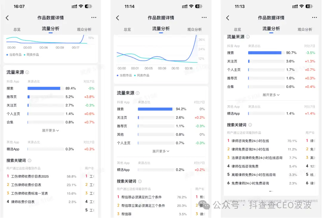 - 搜索流量逐渐上涨:意味着账号内容覆盖的关键词精准命中了当下用户高频法律诉求