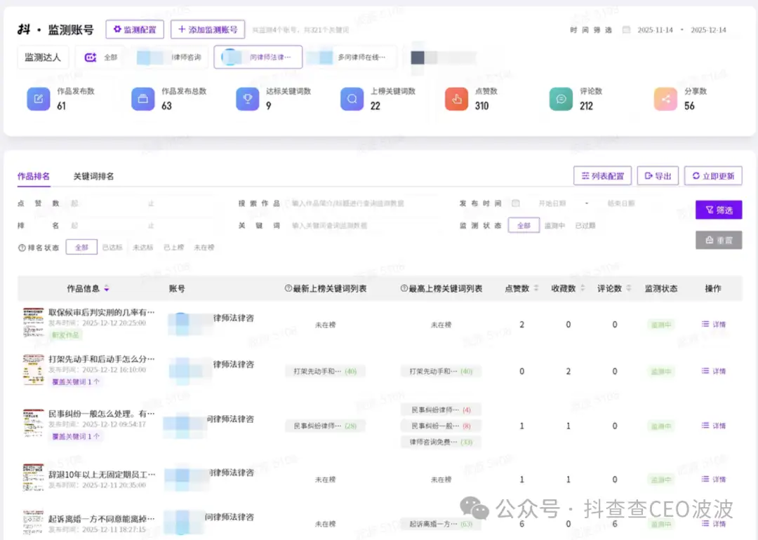 - 根据不同账号定位,对关键词进行拆分分配(如A账号主打婚姻家事,重点布局婚姻相关关键词;B账号主打劳动纠纷,重点布局劳动相关关键词,从账号主打刑事问题咨询,重点布局咨询量多的罪名)