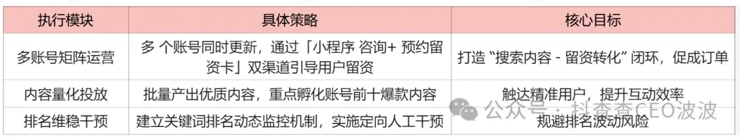 - 建立关键词表格,记录关键词、热度、竞争度、匹配内容类型、对应账号、排名情况、转化数据等信息,定期复盘。