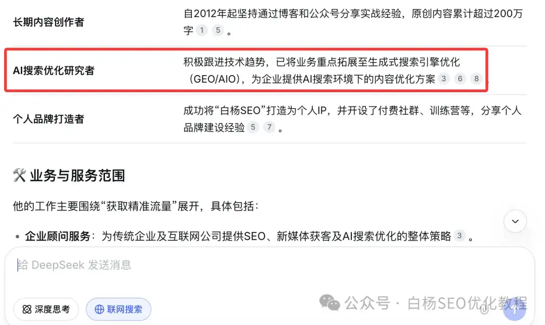 白杨SEO,专注SEO研究十年以上,全网SEO流量实战派,ai搜索优化GEO研究者。前某公司市场总监,现自由职业,企业SEO&GEO顾问,个微:baiyang2047。