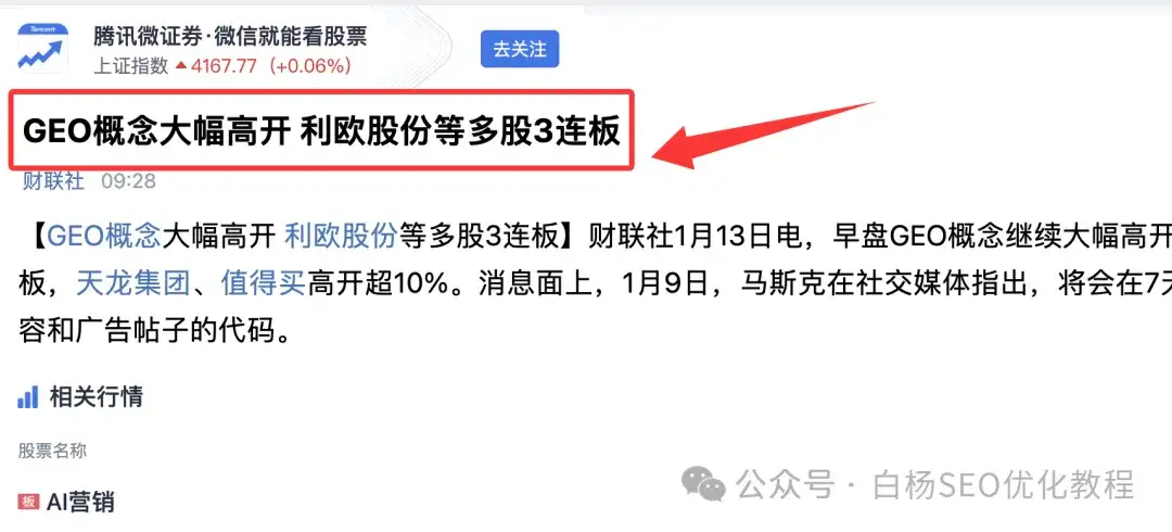 这就是中国市场现在热议破圈的GEO,从推广直接破圈到炒股圈。如图,