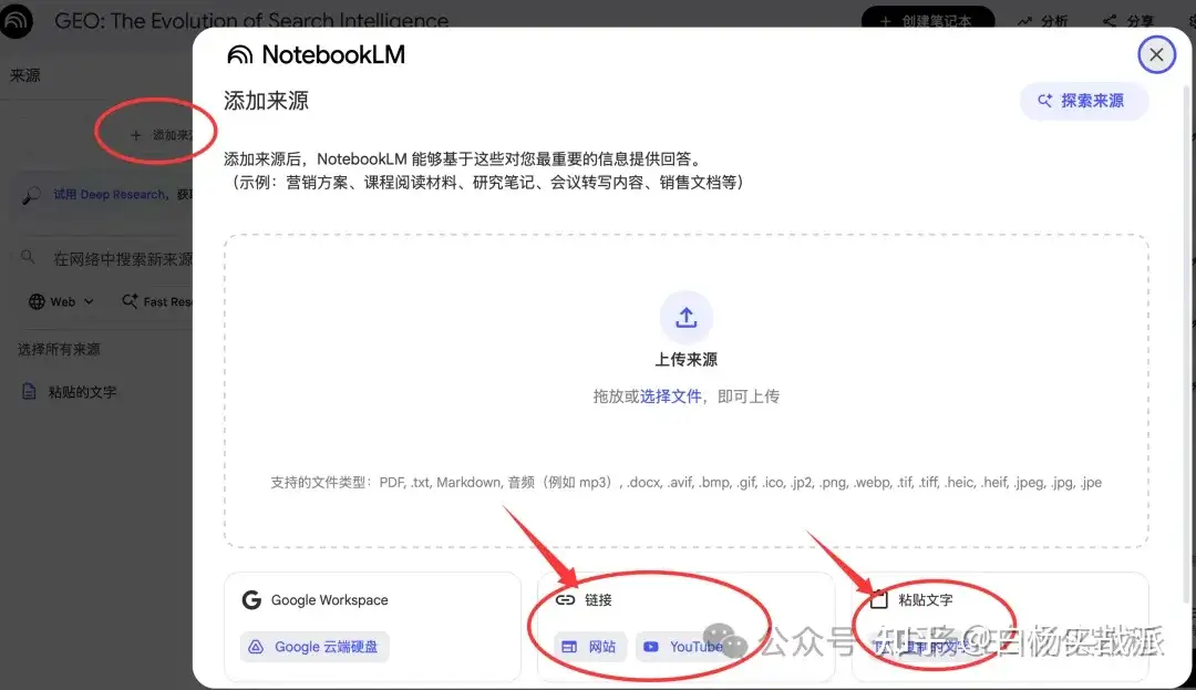 第三,我们在想要做什么之前,需要把内容上传到这个notebooklm里,点添加来源,操作如图。