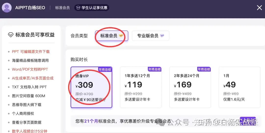 但这个AIPPT一年才一百出头,如果你买终身也才三百多点,如图。