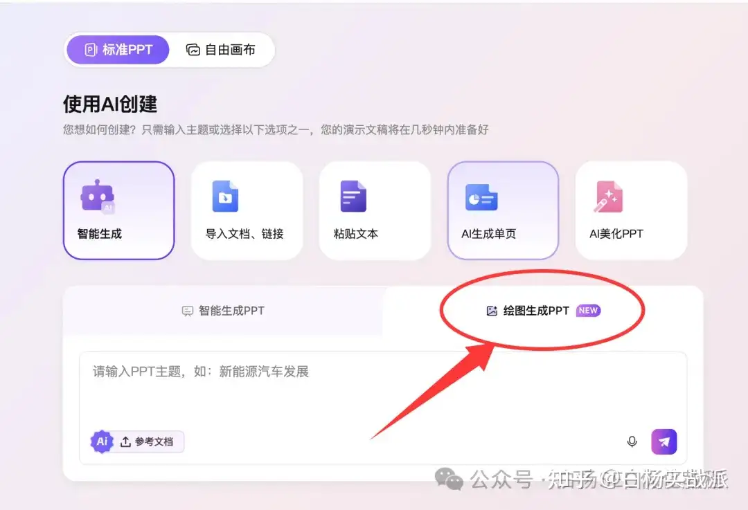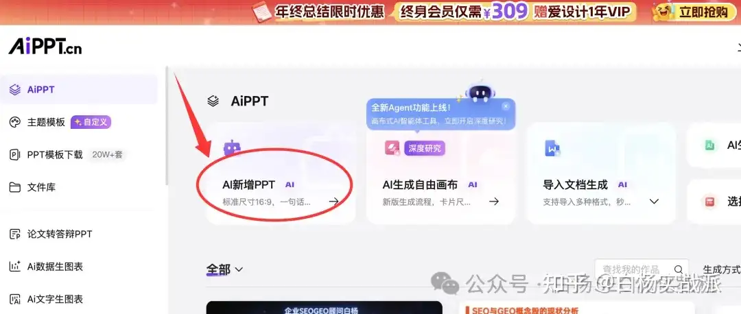 第一步,我们进到进到AIPPT后台,你注册好后登录就进到了,点AI新增PPT这个,如图。