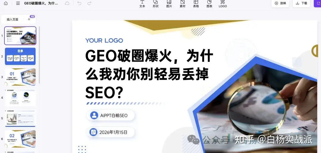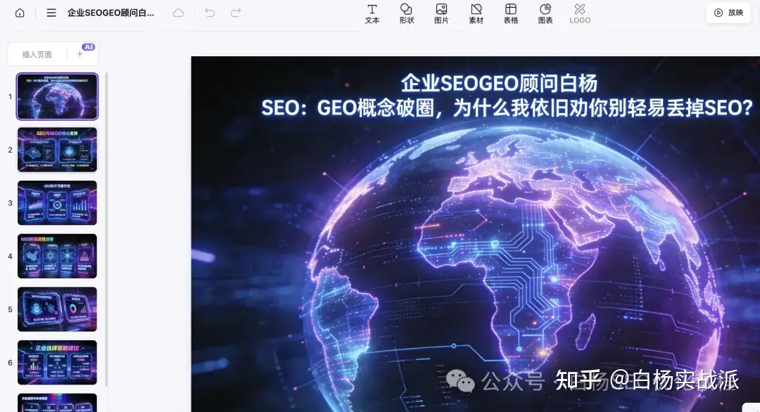 是我才写的这篇长文:GEO破圈,豆包爆火,为什么我劝你别轻易丢掉SEO?生成PPT如图: