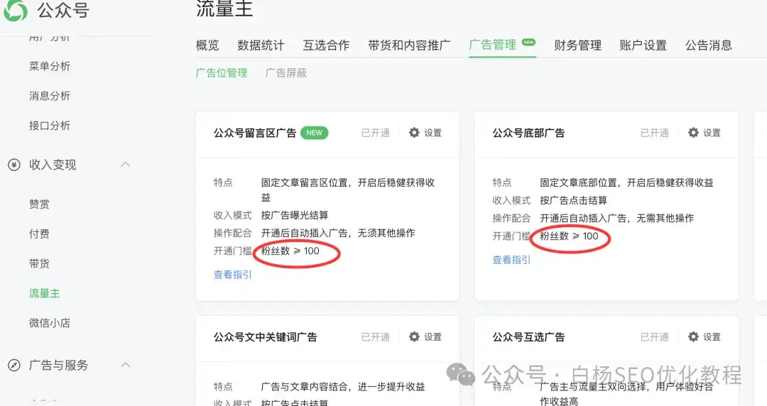 现在公众号粉丝大于100就可以开流量主,如图,最早是要5000!