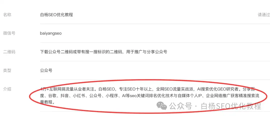 比如拿白杨SEO这个公众号举例就是做垂直精准号,为什么开头写全网SEO流量实战派,包括描述,如图。