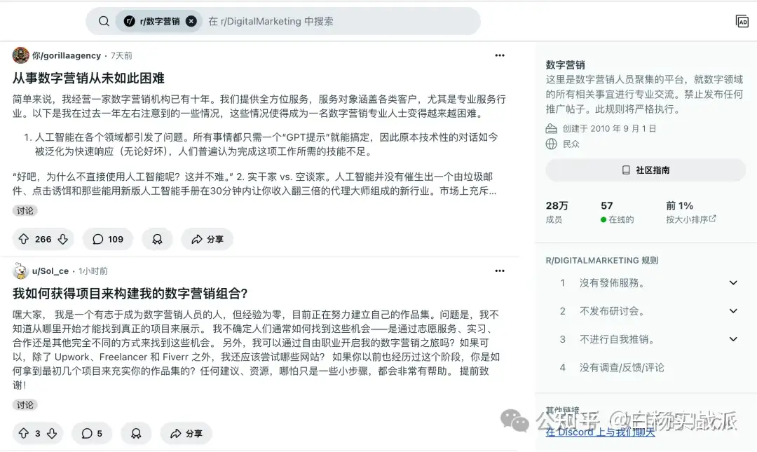 然后我还去那个数字营销 digital marketing社群里面去瞄了一下,这个氛围这个社群也比较活跃,发帖的限制也没那么明显,大家聊的都很直接,都是目前遇到的问题,我很喜欢这个社群。