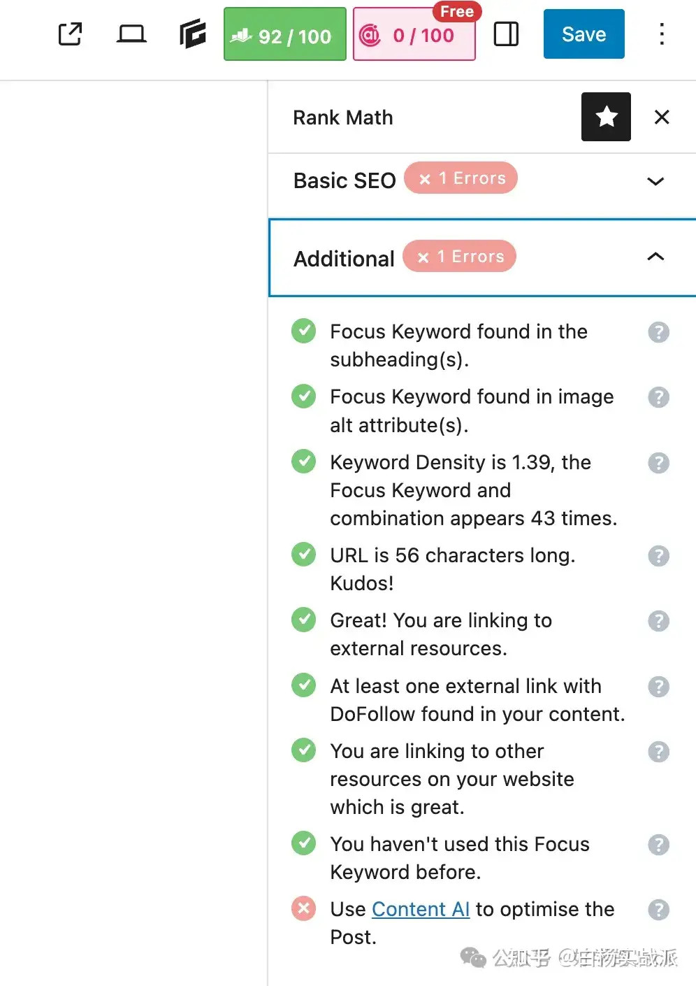再重点讲 RankMath,我之前在文章里专门盘点过 5 款 SEO 工具,它的评分体系堪称内容优化的 “指南针”。只要你的文章字数超过 2000 字,再搭配内链、图片、外链、视频和 FAQ 板块,基本都能拿到 90 分以上的高分;而达到这个分数的内容,往往一到两周就能获得可观的排名和曝光。