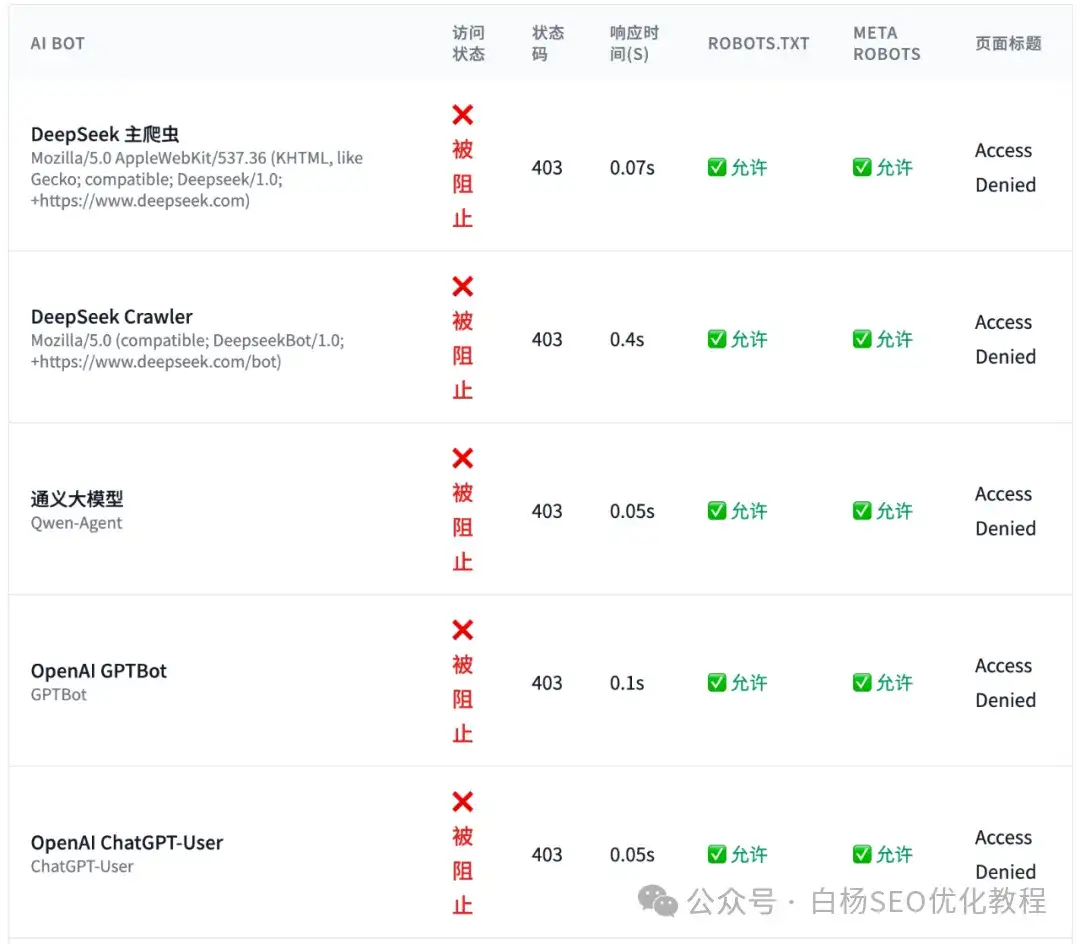 ⬆️错误案例:某个网站在服务器端错误配置,屏蔽了 AI爬虫(使用 AI 爬虫抓取验证工具的截图)