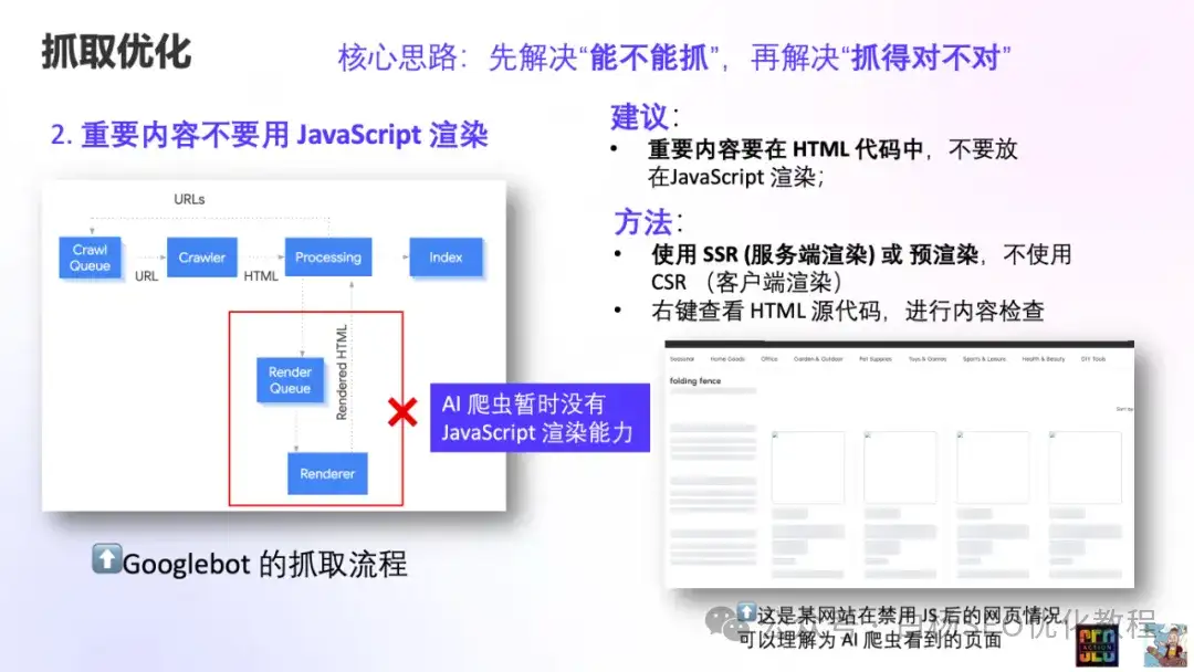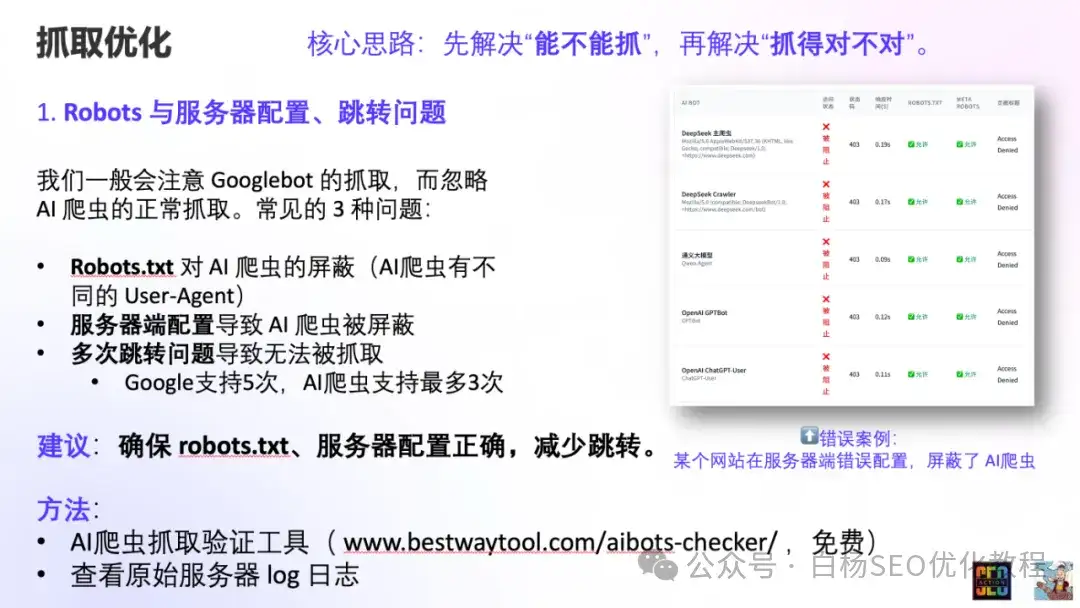 抓取优化:要注意robots.txt配置、服务器配置,保证 AI 顺畅抓取;重要内容不要放在 JavaScript 中,方便 AI 爬虫识别