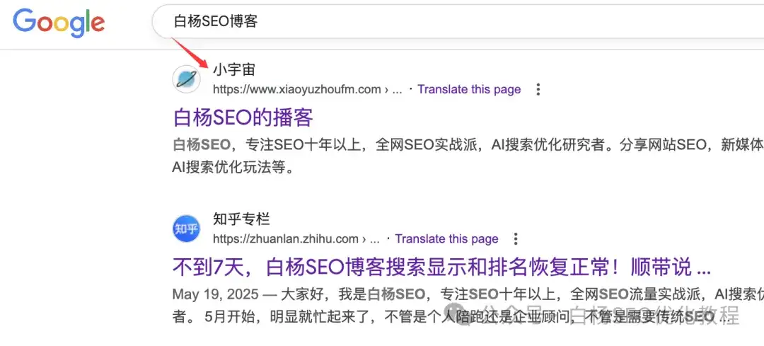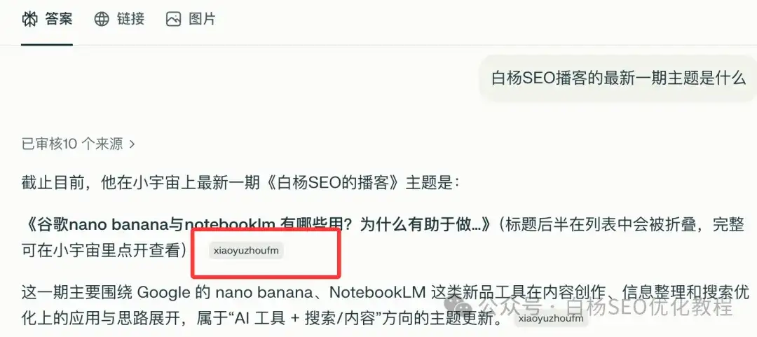 白杨SEO补:目前小宇宙播客不管是google还是AI搜索工具都抓取到,如图,大家可以去把自己文字转播客或者去做下这个试试。