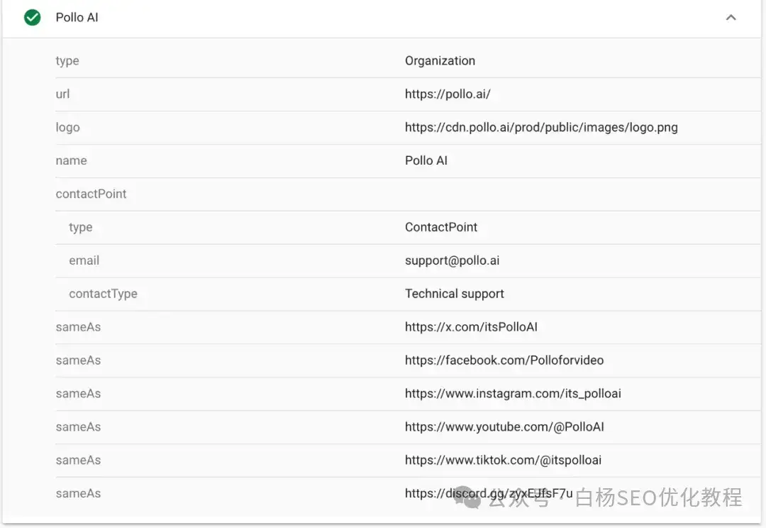 以上是 Pollo AI 首页 Organization 的结构化数据,除了品牌信息外,还将其他社交媒体账号的做了关联,方便 AI 理解。