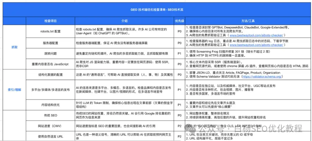 我整理了一份详细的技术性 GEO 自查表,涵盖从代码层到内容层的 10+ 项检查点。