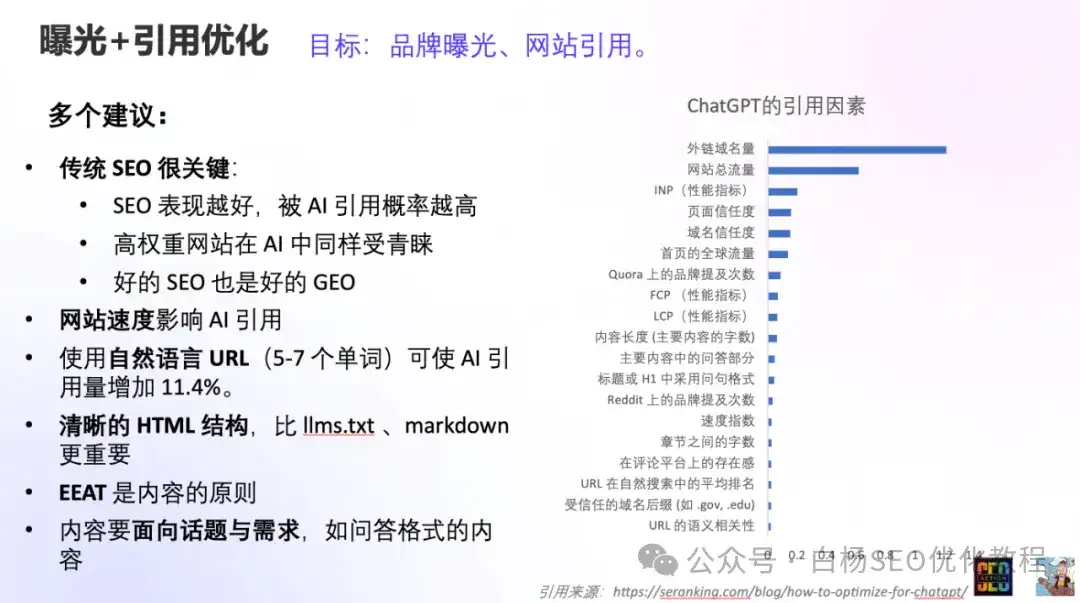 曝光/引用优化:传统 SEO 仍很关键;网站性能、自然语言URL、清晰的HTML都是技术端重要因素;内容端要注意 EEAT、问答型表达、解决用户问题