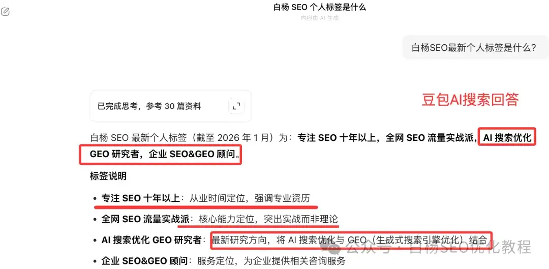 - 白帽 GEO:利用 AI 来提升效率。我们要借助 AI 来传递价值,建立信任,而不是批量产出低价值内容、欺骗用户和 AI