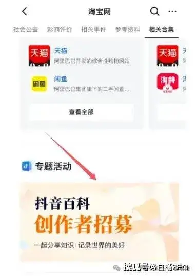 第一个方式,我们直接打开抖音APP,随便搜索一个词条,比如淘宝网,进到他的百科最底部有一个创作者招募点击进去即可,如图。