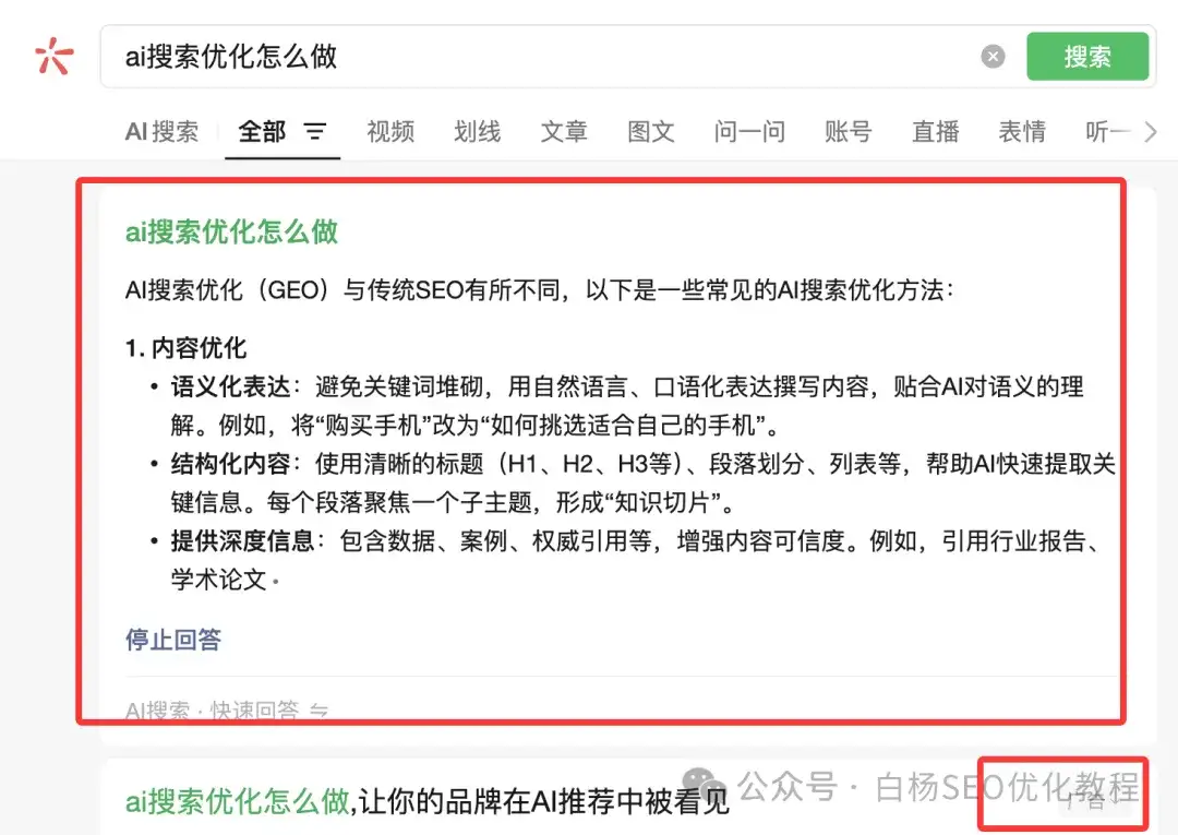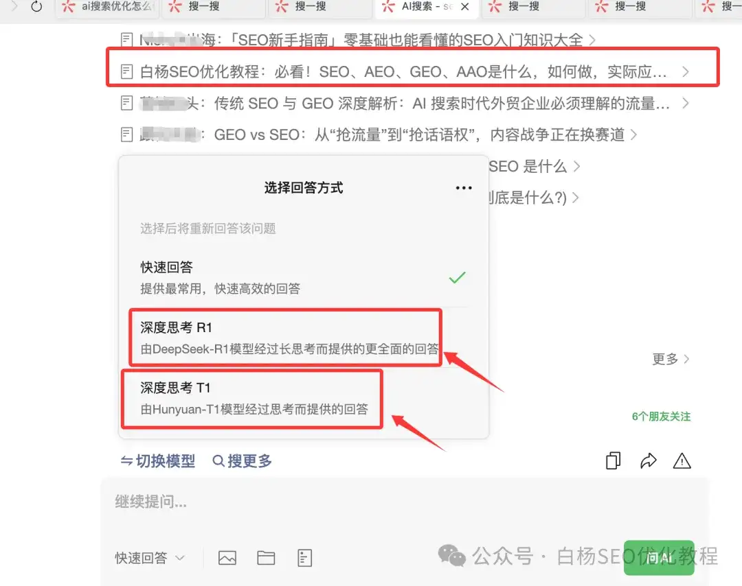 如上图,白杨SEO告诉你,他除了引用公众号,你看它默认是快速回答,简单理解还是用的元宝+deepseek技术结合的,所以要做微信AI搜索优化,可以参考元宝+deepseek综合引用,还是公众号文章为主。