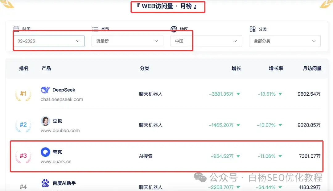 当然,夸克搜索里AI搜索那个AI跟千问逻辑一样,大家也要重点关注,夸克是AI类网页流量第三,AI搜索内第一,比百度AI搜索还多,如图。