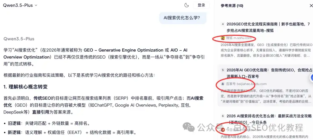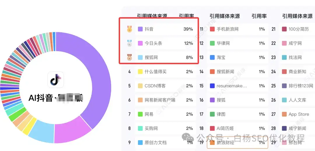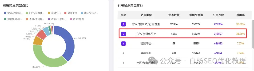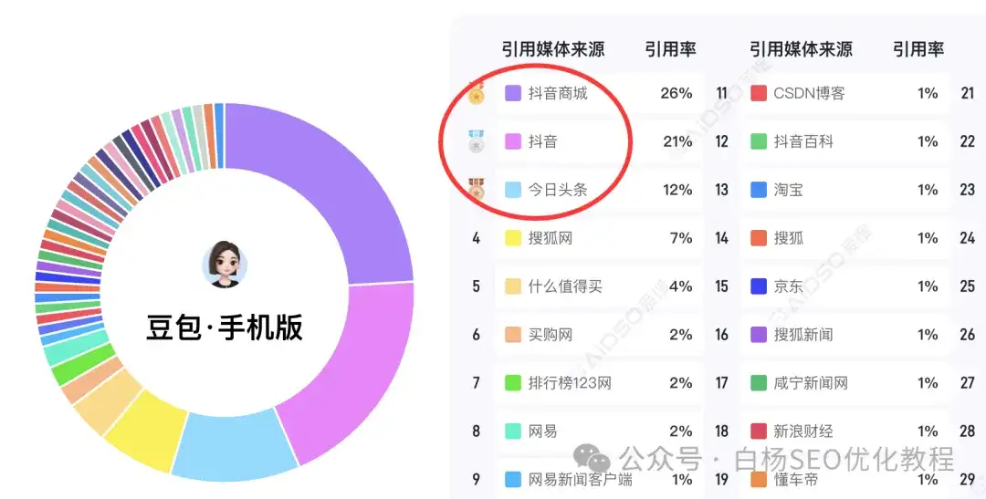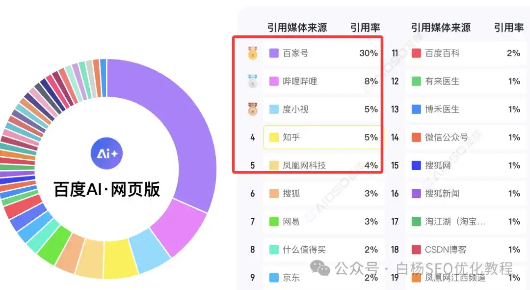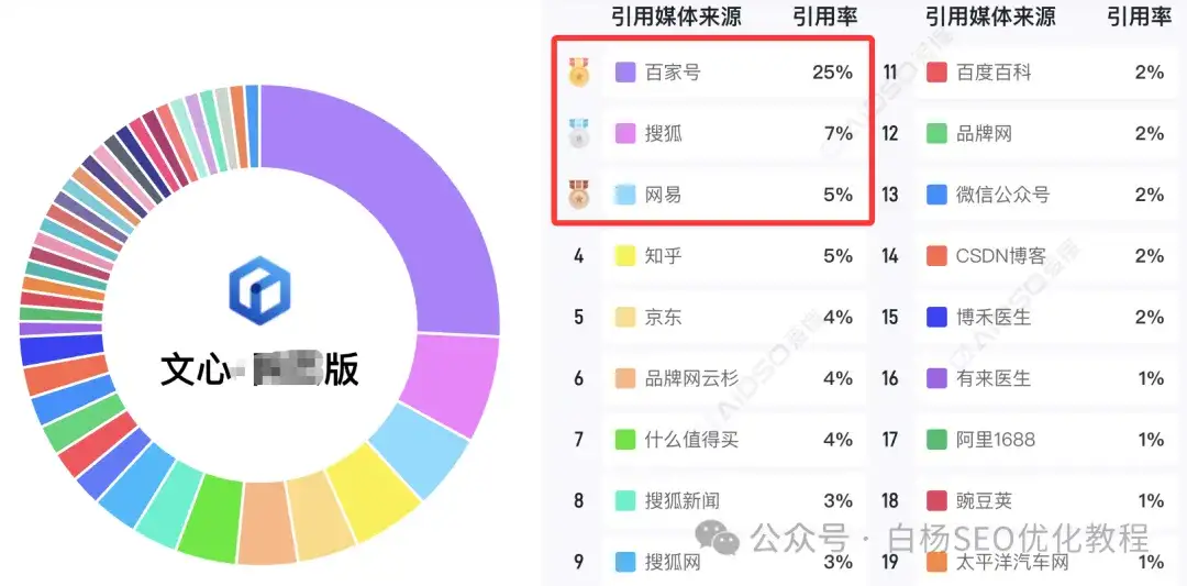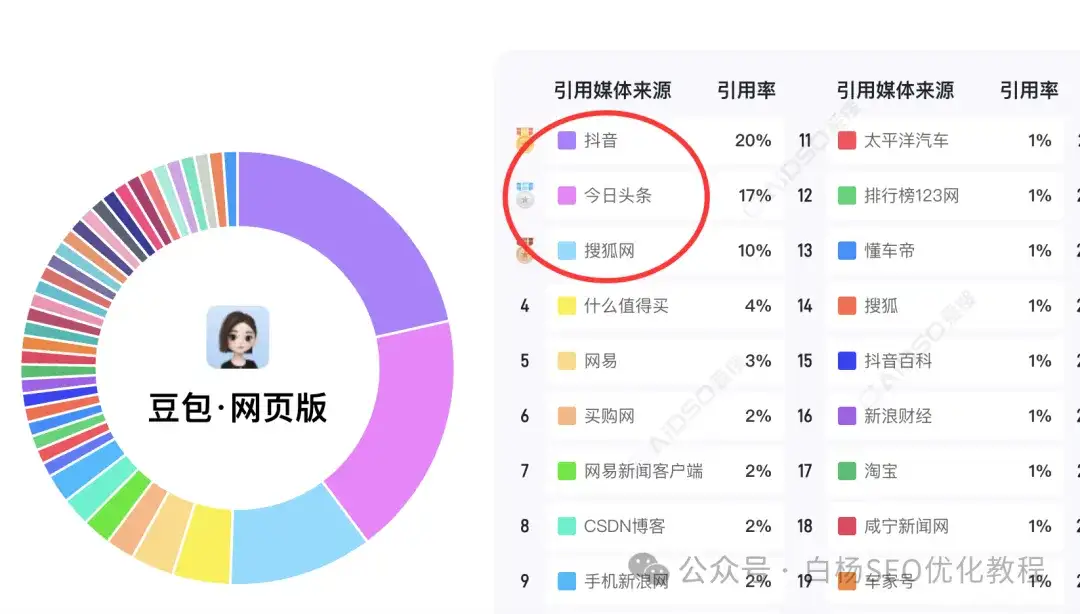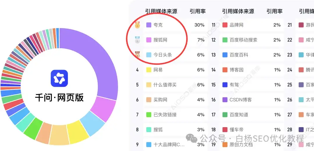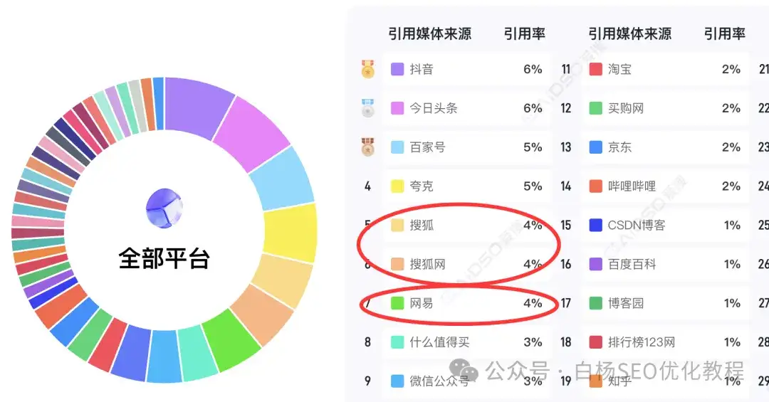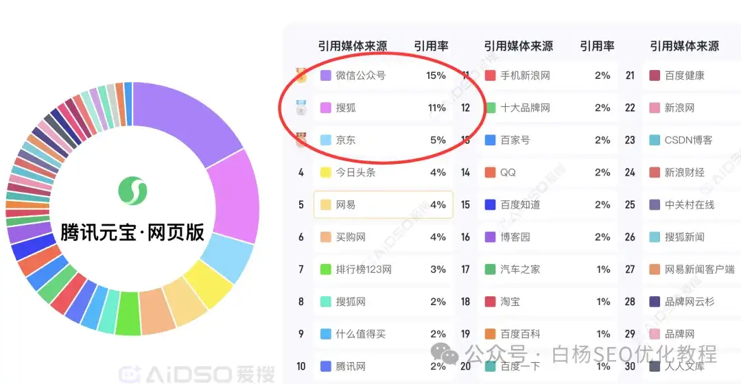 白杨SEO说一下,这里只是参考,并不完全准确,因为这是媒体引用源,那像企业官方网站未来肯定会越来越重,因为它没有豆包、元宝,千问,甚至百度的内容生态。目前来说,媒体上,搜狐、网易和腾讯上不管是新闻,还是自媒体号,引用都还不错的。