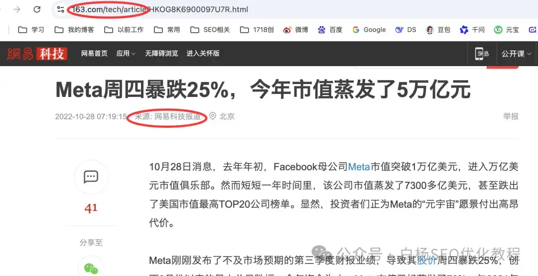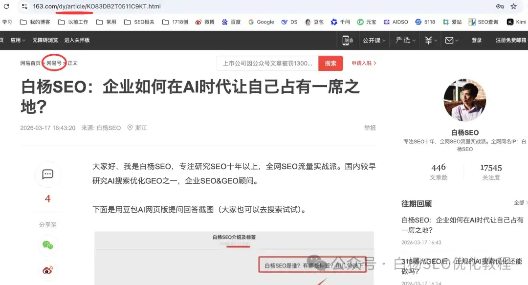 白杨SEO自己实战举例,网易自媒体网易号发的内容如下图