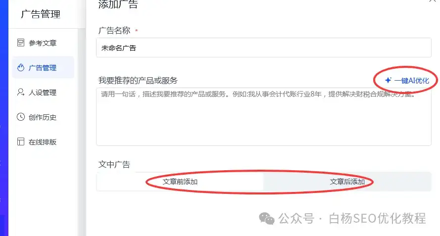 3)设置广告模板:可以加入自己的广告,比如,“我是白杨SEO,专注SEO十年以上,全网SEO流量实战派,AI搜索优化GEO研究者。”,如果你不会写,也可以一键AI优化。