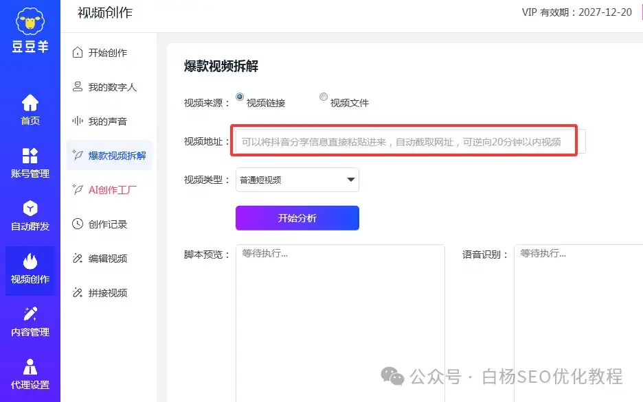 1)先去抖音或小红书找到对标视频(可以是爆款,也可以是搜索排名靠前的),把链接放入进去,如图。