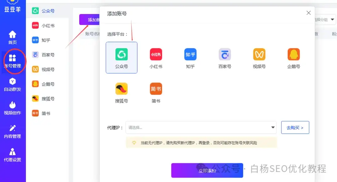 这里可以添加公众号、小红书、知乎、百家号、视频号等。选定好平台后,然后购买代理IP(10元/月,主要防关联风险)选好,点添加即可。